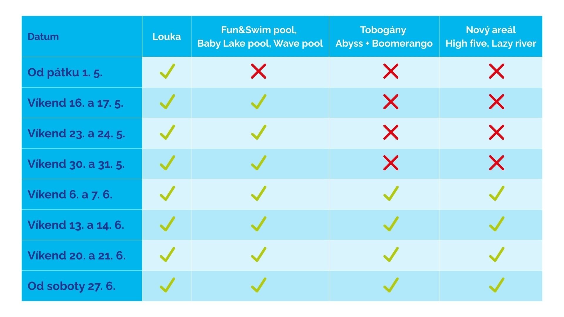 Přehled otevřených atrakcí a bazénů